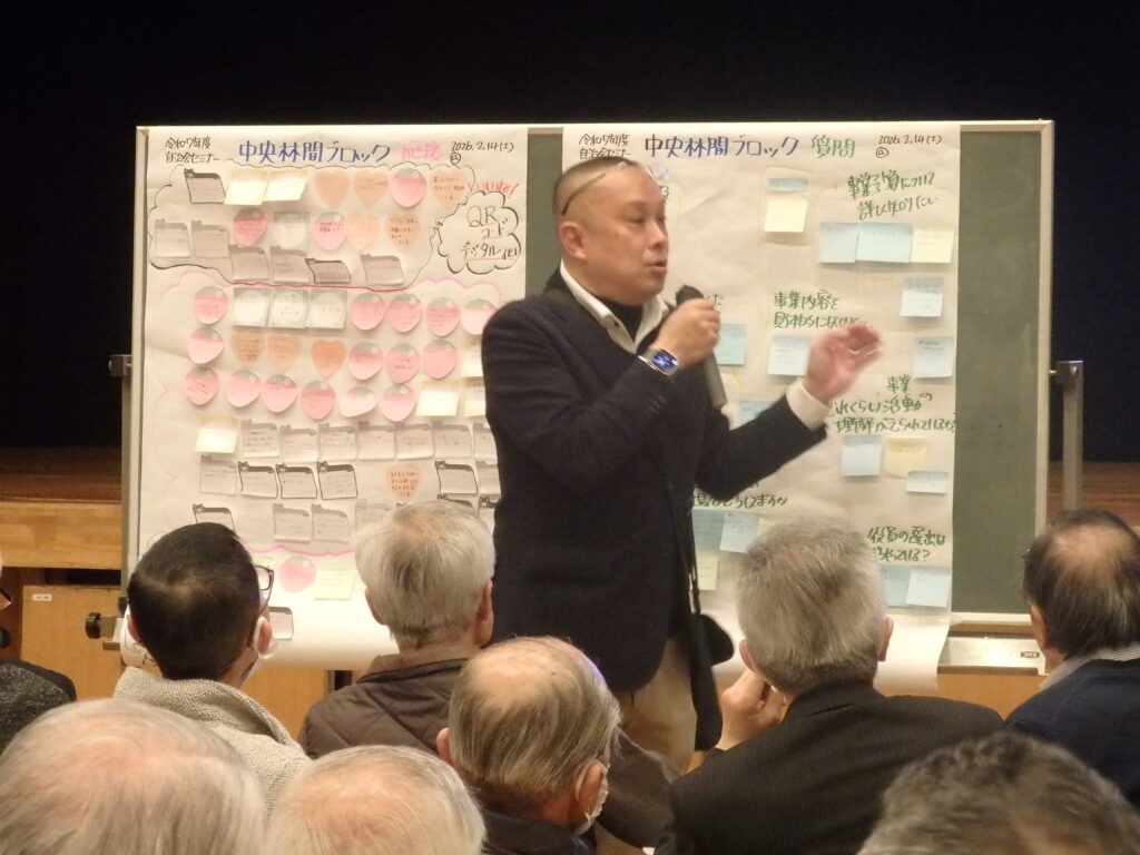 令和8年2月14日、大和市保健福祉センターにて「令和7年度 自治会セミナー」を開催いたしました。当日は88名の自治会役員・会員の皆様にご参加いただき、市内自治会の先進的な取り組み事例を共有するとともに、これからの自治会運営について活発な意見交換が行われました。